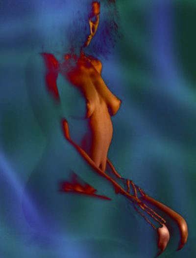 Siehe nur, wie der scheinbar glühende Nebel zart die erotischen Formen umschmeichelt. Trotz sanfter Verhüllung mit blauem Dunst wirkt die starke Erotik im Bild, ohne dass der Körper eine besondere auffordernde Haltung einnimmt. Der durchgedrückte Rücken präsentiert die Rundungen der wohlgeformten Brüste bestens. Man möchte sie ergreifen, stellt sich vor, sie anzufassen, zu küssen und zu lecken. Das Gesicht, nur halb zu sehen, der Rest verdeckt durch Haar und eben diesen blauen Dunst, lässt eine hübsche Frau erahnen, jedoch wissen kann man es nicht. Sie hat etwas Fremdes, etwas Exotisches. Ihre Hände ruhen auf ihren Oberschenkeln. Diese und der herrlich straffe Po schimmern durch den glühenden Nebel und entfachen im Betrachter ein Feuer mit sehr heißer Glut.